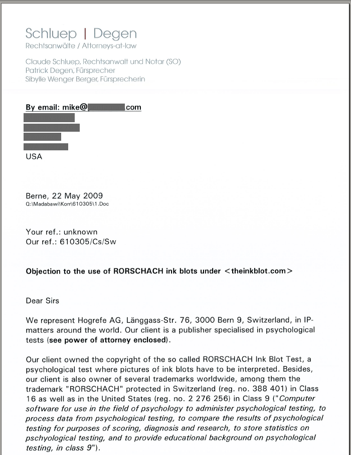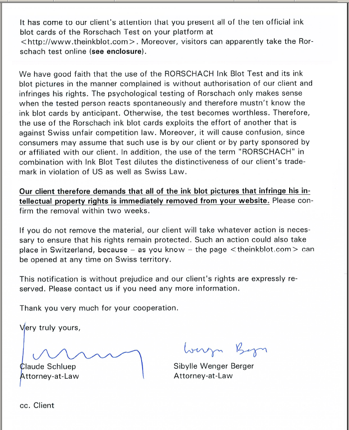 Recently we received a "take down" letter from lawyers associated with the Rorschach Ink Blot test, claiming that we infringed on their intellectual property. Since our wonderful images aren't actually the real Rorachach images, we had the pleasure of writing them and telling them to a) do a better job of lawyering, and b) to piss off.